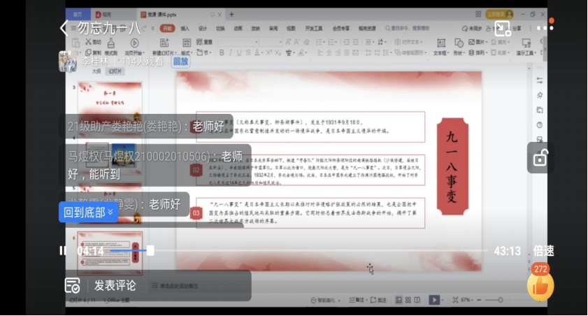 牢记历史,就是开创未来。为教育广大青年员工不忘国耻,珍爱和平,增强爱国主义意识,yl8858永利于9月28日晚,通过线上钉钉开展了“勿忘九一八,吾辈当自强”主题党课活动。本次党课由yl8858永利李桂林老师主讲,yl8858永利部分党员教师及21级积极分子聆听了此次党课。