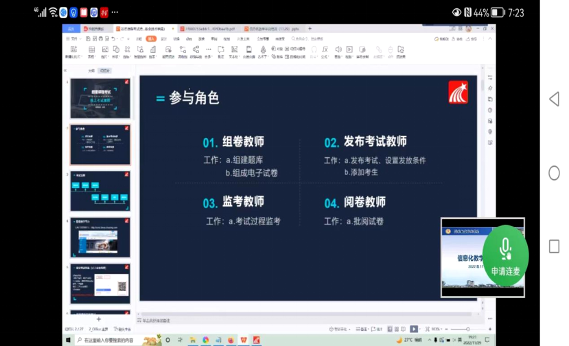 此次培训采用超星线上直播的方式进行,超星集团技术培训老师对超星网络教学平台课程内各模块功能、考试功能全流程(如何完善题库、如何组卷、如何发布试卷、如何在线监考、如何批阅试卷、如何统计数据)、超星直播客户端使用等内容结合具体案例进行了详细的介绍和实际操作演示。公司教师认真聆听,并就操作过程中出现的问题与培训师进行线上交流。