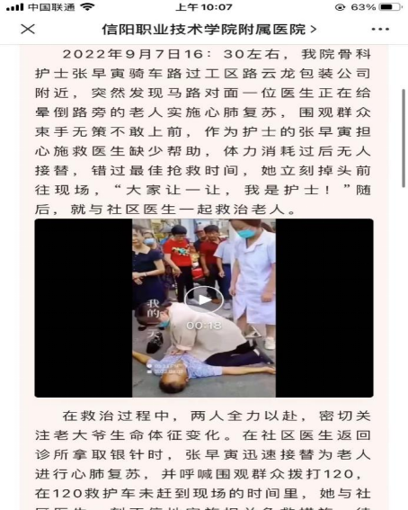 辅导员寄语:她是一个积极向上、勤奋好学的姑娘,看到网上对张早寅同学的报道我甚为感动,为我班有这样的员工而感到自豪!张早寅同学在校期间努力扎实地学习护理知识与技能,表现出色,是一个富有责任感和使命感的好员工。张早寅同学牢记了公司对她的谆谆教导和授帽仪式时的誓言,她毫不犹豫的跪地救人,这就是一个医护工作者的职业素养,也是对生命最好的致敬和守护。希望她在今后的护理岗位上继续发光发热,她的事迹值得我们每个医护人员去学习!