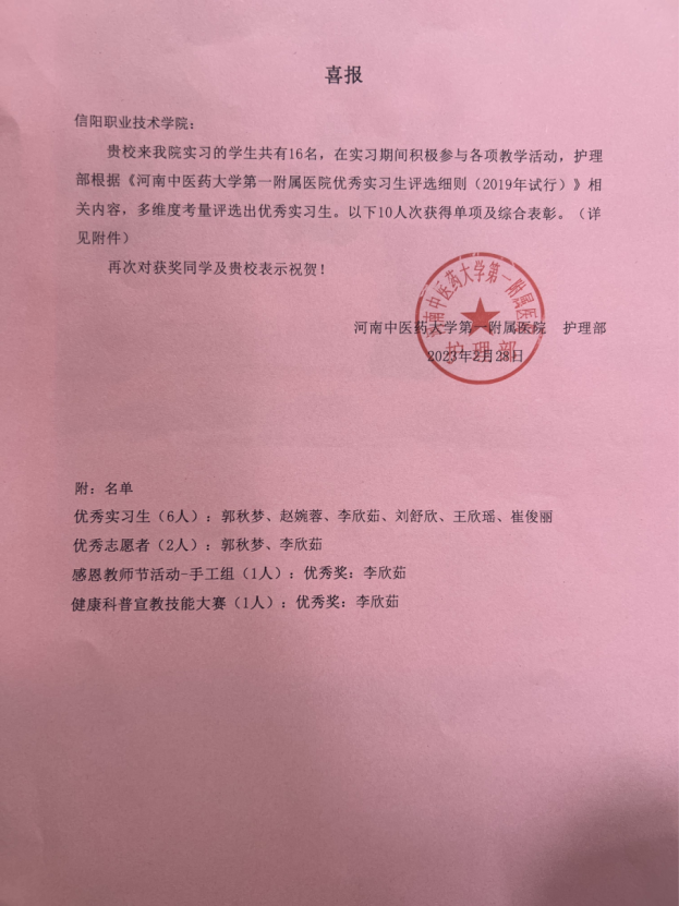 2月28日,从河南中医药大学第一附属医院传来佳讯,医院护理部根据《河南中医药大学第一附属医院优秀实习生评选细则(2019年试行)》相关内容,多维度考量评选,公司16名实习生中有10人次获得单项及综合表彰。